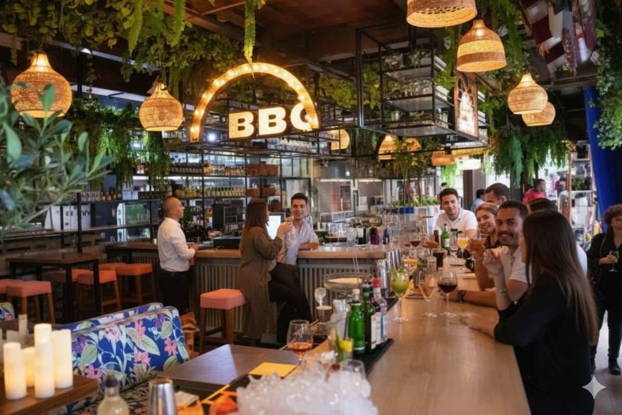 Bogotá’s nightlife has no shortage of good bars and clubs, but Bambule Food & Drinks hits a different note — more tropical, more playful, and somehow more personal. It’s a place that feels alive from the second you walk in. The green lights, the leafy décor, the DJ spinning reggaeton and dance hits — everything works together to create the sense that you’ve just stepped into a hidden jungle in the middle of the city.
