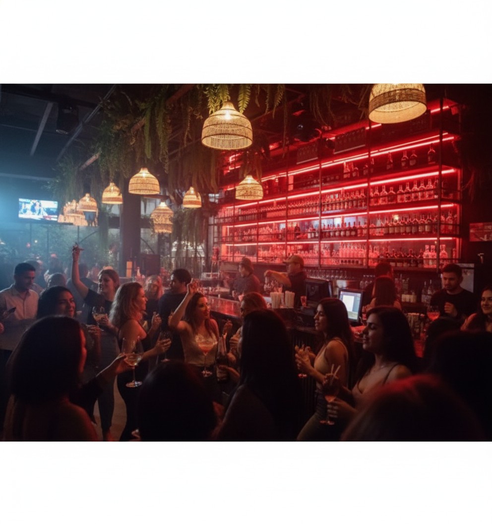 You’ll find Bambule in the heart of Bogotá’s nightlife corridor — Carrera 13 #83-47, surrounded by other bars, restaurants, and lounges. From the street, the neon glow and steady pulse of bass are impossible to miss. Step through the entrance, and you’ll find yourself surrounded by foliage, light, and sound — a cozy jungle oasis designed for celebration.