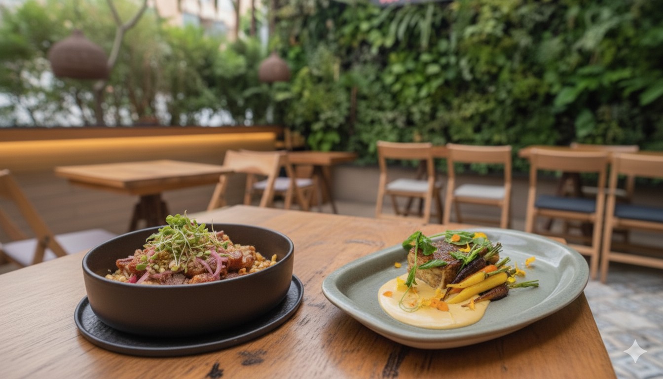 Walking in, you feel a gentle hush — soft lighting, greenery around, natural materials (wood, stone, plants). The décor hints at a garden-atelier hybrid — walls with climbing vines, delicate lamps, planters, terracotta tones, touches of metal and glass. The lamps are dim enough to be intimate, bright enough to read the menu. There’s space between tables; you don’t feel squeezed.