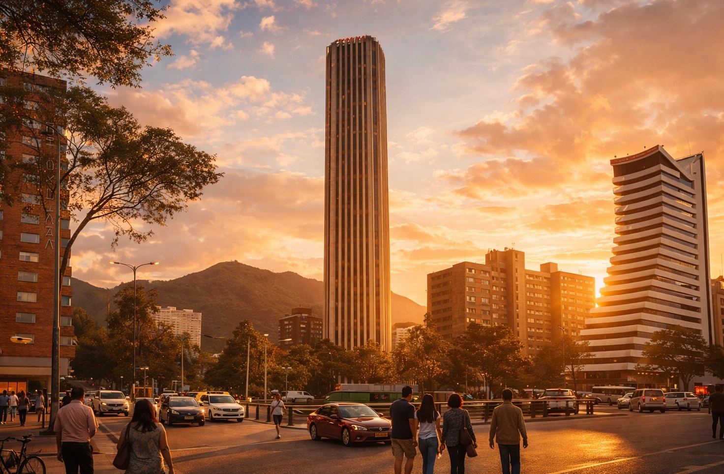 Experience: Elevator up → 360-degree Bogotá → sunset over mountains