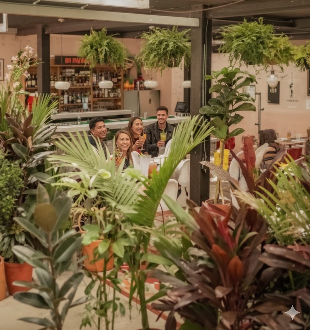 During the day, the sunlight filters through hanging leaves and large glass panes, giving it a bright, airy café vibe. It’s a great spot for a relaxed coffee or a light dessert and mocktail. In the evening, the whole atmosphere changes. The lights dim, the candles or small bulbs under the plants glow warmer, and the background music gets just a little deeper — still quiet enough for conversation, but with a rhythm that gives the place energy.