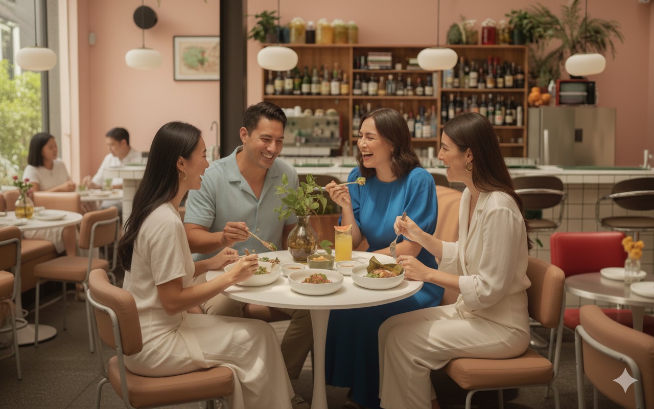 • Thoughtful space design — garden feel, vintage touches, soft light.